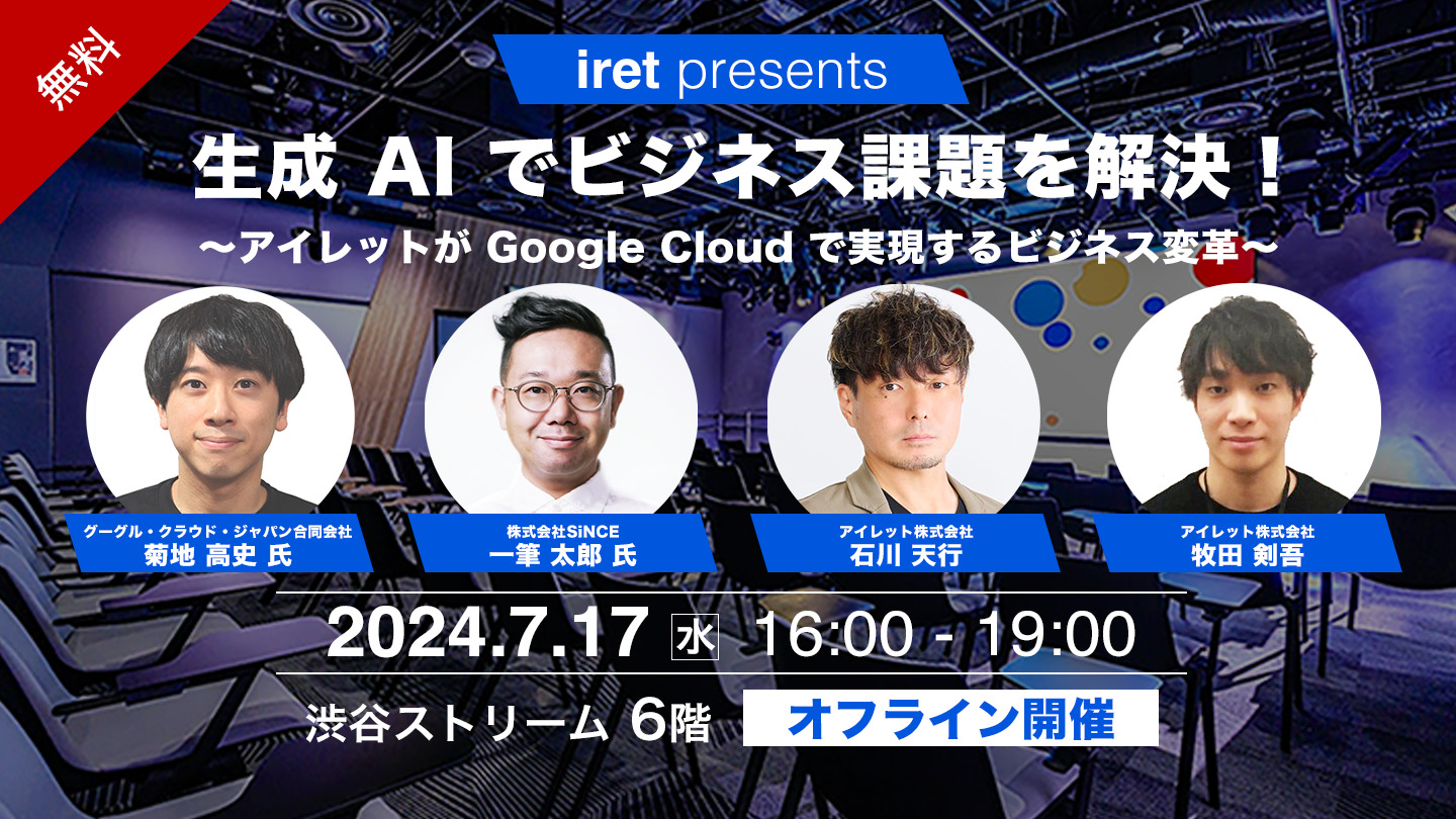 | イベント名 | 【iret presents】生成 AI でビジネス課題を解決!~アイレットが Google Cloud で実現するビジネス変革~ |