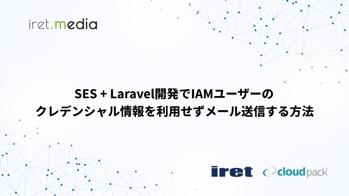 # メッセージを送信するために使用される既定のメーラーを制御(詳しくはconfig/mail.phpを参照) MAIL_MAILER=ses # 送信元のアドレスを設定 # ローカル部は任意の文字列 # ドメイン部はSESで設定したドメインを使用 MAIL_FROM_ADDRESS="test@iret-ses.jp" # 任意の送信者名 MAIL_FROM_NAME="mail-send-test" # わかりやすいように今回は空でいれてあります # 変数を定義しているだけでも上手く動作しないということもあるようなので適宜調整してください AWS_ACCESS_KEY= AWS_SECRET_ACCESS_KEY=