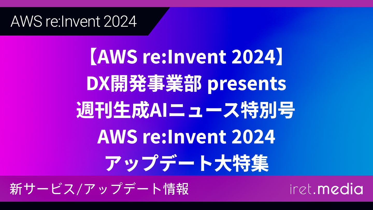 週刊でお届けしている生成AIニュースですが、本記事では特別号として、2024年12月2日から12月6日の間に開催された AWS re:Invent 2024で発表された、AWSの生成AIサービスに関するアップデートに関してまとめております!