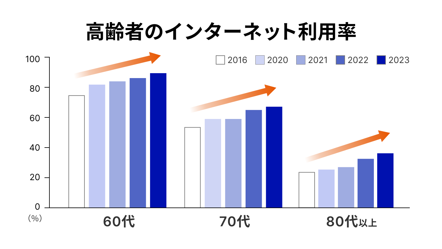 高齢者のインターネット利用率は増加傾向にあります。60代では90%を超えており、70〜80代の利用率も年々増えています。