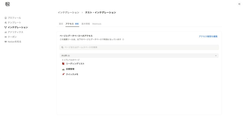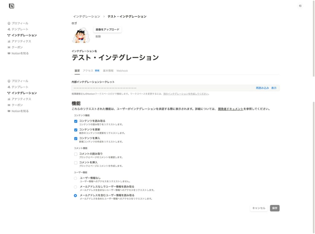 MCPから対象のNotionデータを取得するには、インテグレーションページからアクセストークン(内部インテグレーションシークレット)を取得する必要があります。