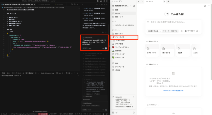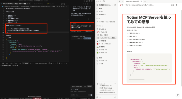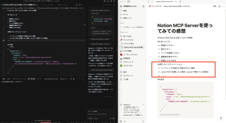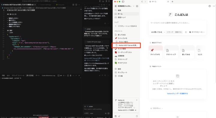 公式サイト等で語り尽くされてはいますが、コーディングにNotionアプリを一々開きたくない、Cursor上で全て完結したい、といった場合に適しているかと思います。