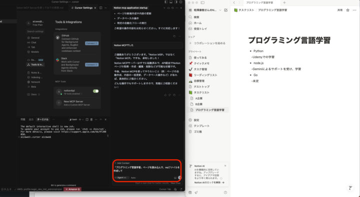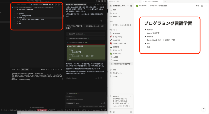 Cursor側にmdファイル(Markdown形式ファイル)を作成し、その内容をそのままNotionにページ追加、また内容を修正して更新を行います。