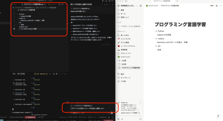 ・mdファイルを編集し、追加したNotionページに反映するように指示