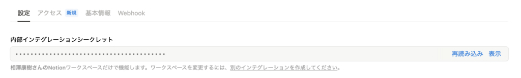 アクセストークンを取得するには、内部インテグレーションシークレットの「表示」をクリックし、表示された「トークン」をコピーします