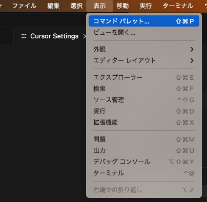 ①コマンドパレットで「Cursor Settings」(設定)を開く