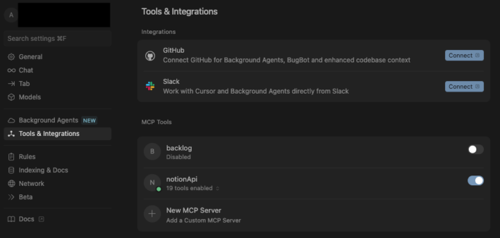 ②「Tools & Integrations」→「New MCP Server」の順で選択