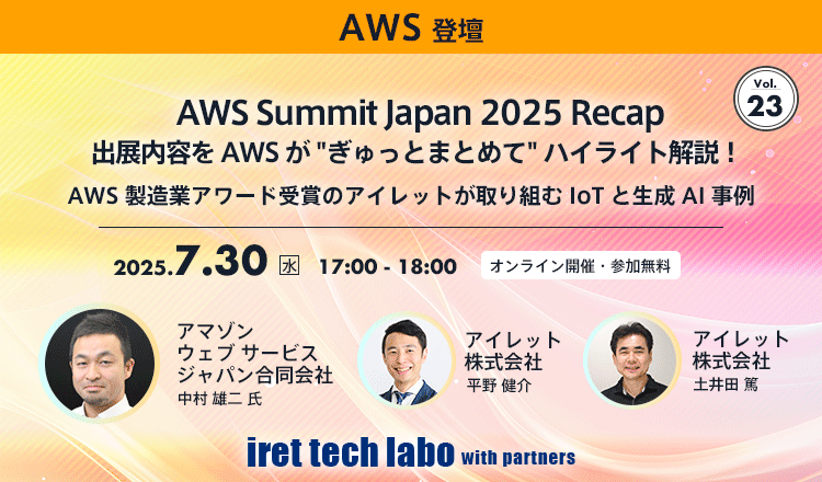 第23回となる今回は「AWS Summit Japan 2025 Recap 出展内容を AWS が ”ぎゅっとまとめて” ハイライト解説!AWS 製造業アワード受賞のアイレットが取り組む IoT と生成 AI 事例」と題し、アマゾン ウェブ サービス ジャパン合同会社の中村 雄二様とアイレット株式会社の平野 健介、土井田 篤が講演を行ないました。