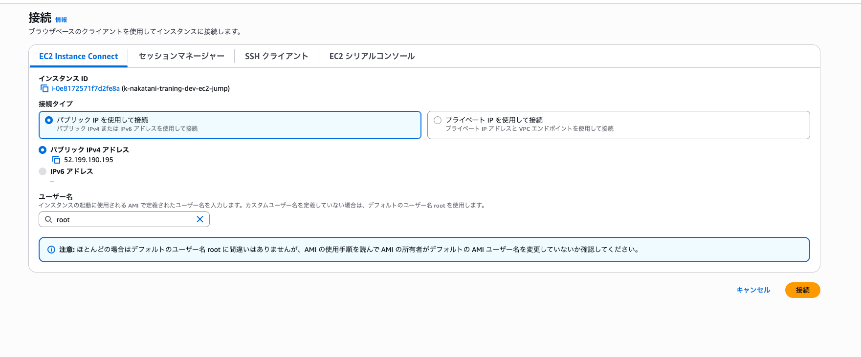 コンソール上でEC2 Instance Connectの画面にて、接続をクリック