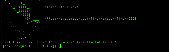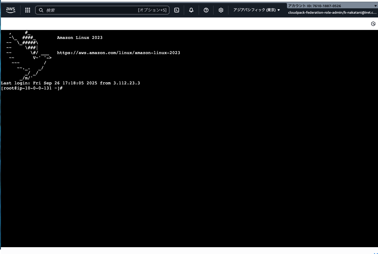CloudShellが開かれ、一時的に作成された秘密鍵を使ってEC2インスタンスにSSH接続する
