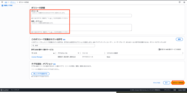 任意のポリシー名と説明を入力し、作成をクリック