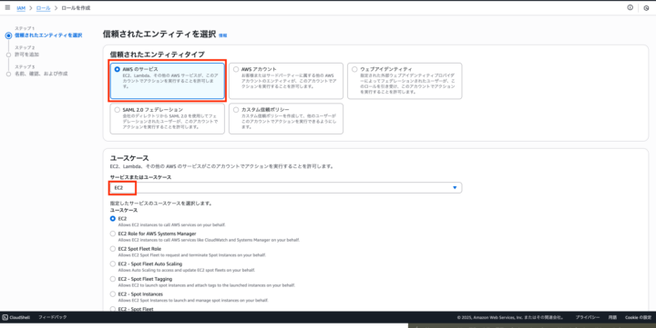信頼されたエンティティタイプでAWS、ユースケースでEC2を選択
