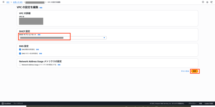 DHCP設定で先ほど作成したDHCPオプションセットを選択し、保存
