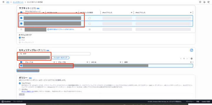 先ほど作成したセキュリティグループ名を検索し、選択して下にあるエンドポイントの作成をクリック