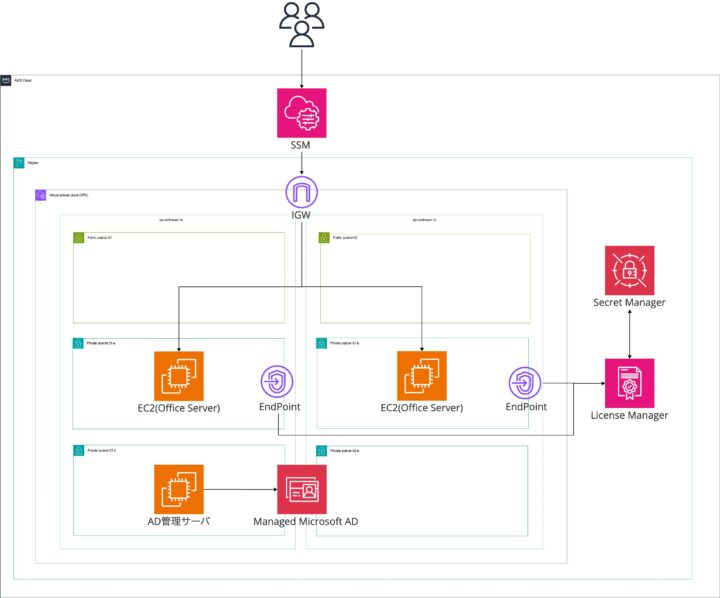 本記事で構築するOffice on EC2環境の構成図は以下の通りです。