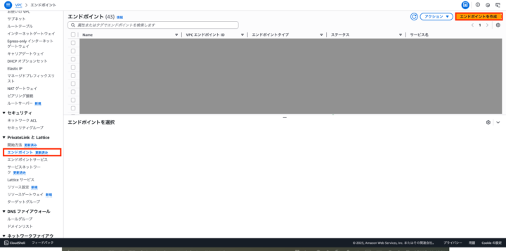 VPCの画面に移動し、左のエンドポイントを選び、エンドポイント作成をクリック
