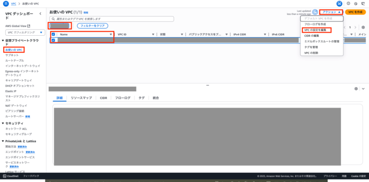 出てきたVPCを選択し、アクションからVPCの設定を編集をクリック
