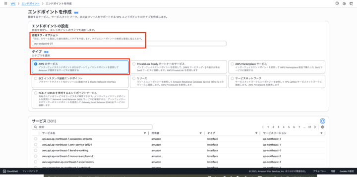 エンドポイントの名前タグを入力し、タイプはAWSのサービスを選択する