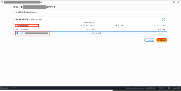 ポリシー名を検索し、選択して許可を追加をクリック