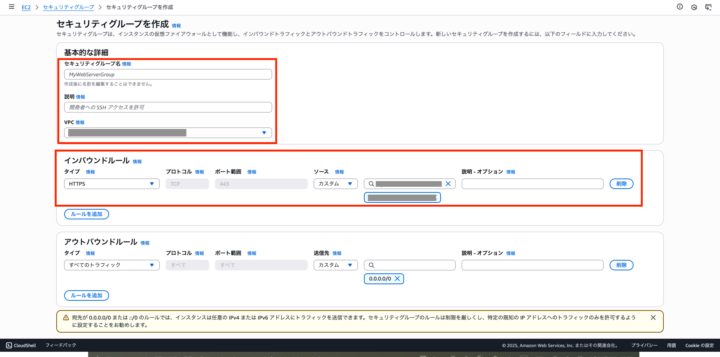 任意のセキュリティグループ名と説明を入力し、VPCにはOfficeライセンス用のEC2インスタンスを起動するVPCを選択します。