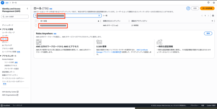 左の欄からロールを選択し、検索バーから先ほど作成したロール名を検索し、ロール名をクリック