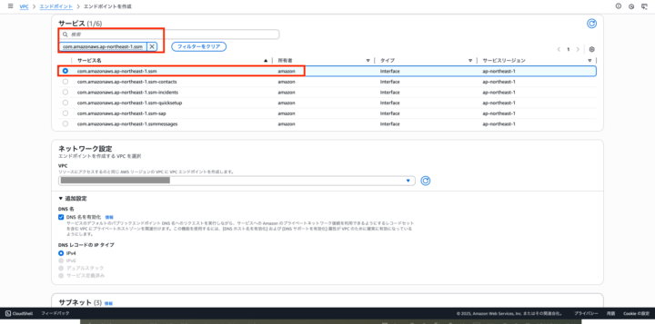 リージョンが東京の場合サービスにサービスの検索欄にcom.amazonaws.ap-northeast-1.ssmを入力する。
