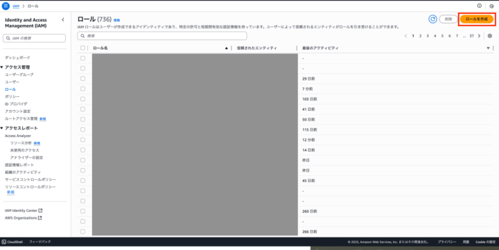 AWSマネジメントコンソールでIAMサービスに移動し、左側メニューから「ロール」を選択後、「ロールを作成」ボタンをクリックします。