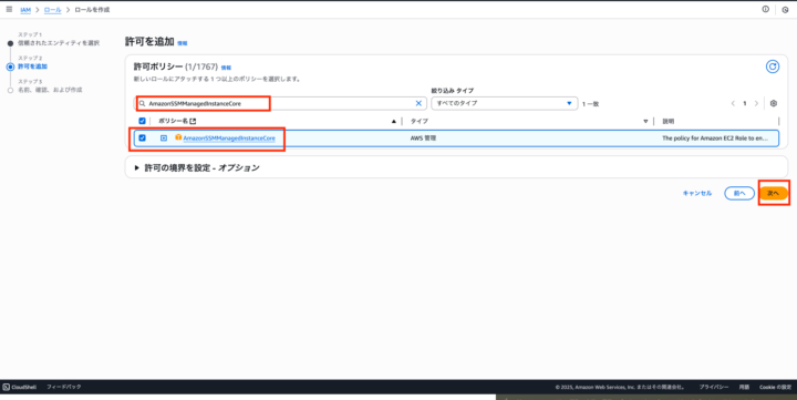AmazonSSMManagedInstanceCoreを上部から検索し、それを選択し、次へ