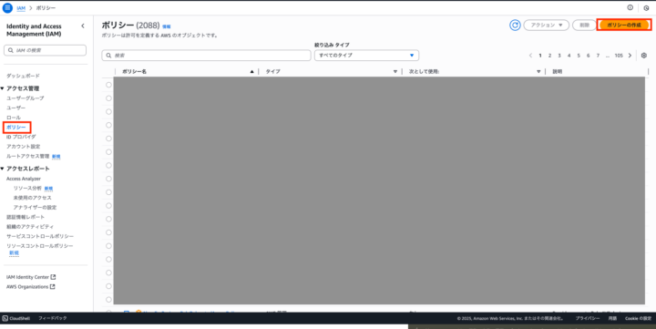 次に、IAMの画面からポリシーを選択し、ポリシーの作成をクリック