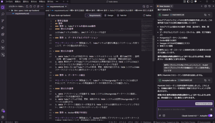 ユーザーは「作りたいアプリの概要」をプロンプトとして入力するだけで、KiroがMarkdown形式で必要な仕様やタスクを整理してくれます。
