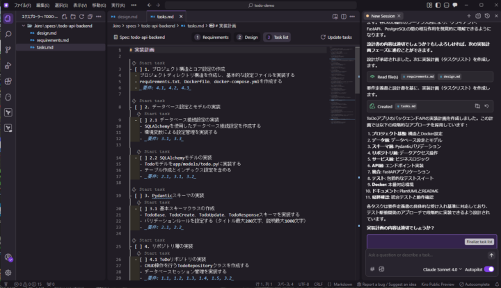 作成された実装計画は .kiro/specs/<プロジェクト名>/tasks.md にMarkdown形式で保存されます。