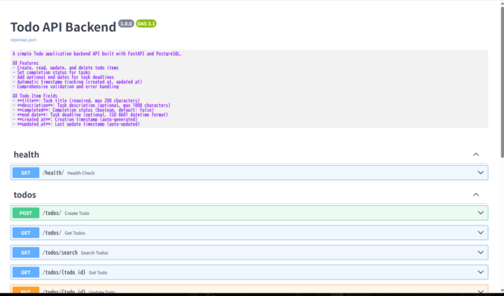 | GET | `/todos` | 全ToDoアイテム取得(期限情報含む) | - | `List[TodoResponse]` (200) |