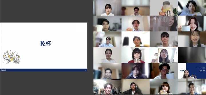 あらかじめそれぞれ好きな飲み物をお手元に用意していただき、画面越しにグラスやペットボトルを掲げて乾杯しました。