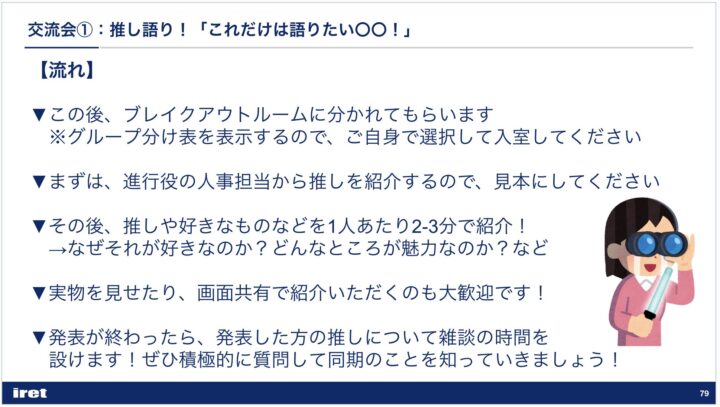アイスブレイクで和んだあとは、人事も交えての交流会です。テーマは「推し語り」。好きなアーティストやアニメ、趣味など、自分の“推し”について熱く語っていただきました。
