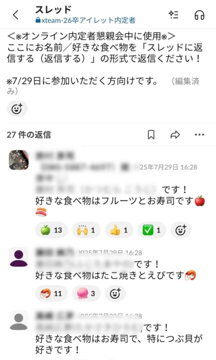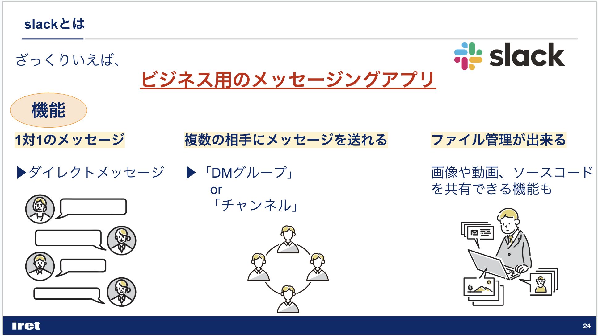 続くSlackレクチャーは、アイレットの社内コミュニケーションに欠かせないツールを、入社前に体験してもらうための時間です。