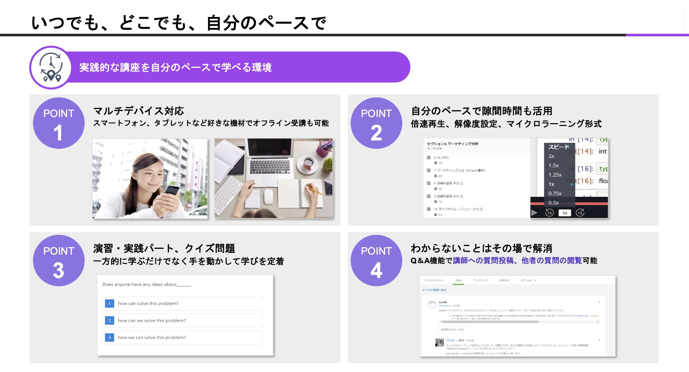 Step1:e-Learning ・Udemy Businessなどの豊富な動画コンテンツでじっくりインプット。 ・動画コンテンツのため、自分のペースに合わせた学習が可能。