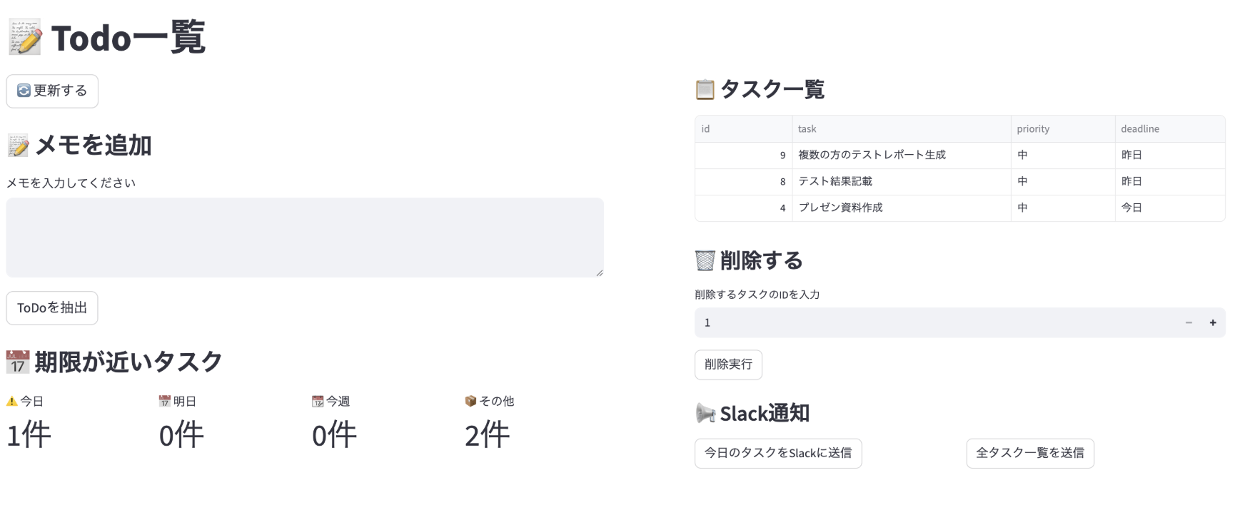 Streamlit版では、メモ追加・一覧・削除・Slack通知が全部1画面に収まり、コード量は約30行に削減できました。