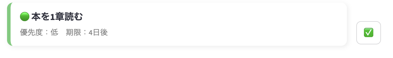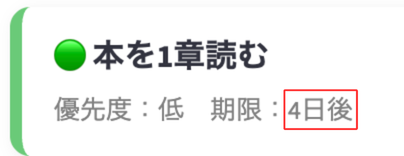 先ほど上記の設定で日付に変換されるように修正をしましたが、画面に表示する時には「今日」「明日」「○日後」のように出力したかったです。これを実現させるためにDBには具体的な日付(例: 2026-04-01)で保存して、画面に表示するときだけformat_deadline()という関数で「今日」「明日」「○日後」に変換しました。