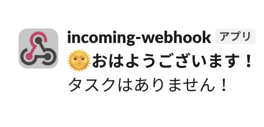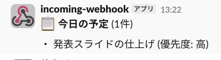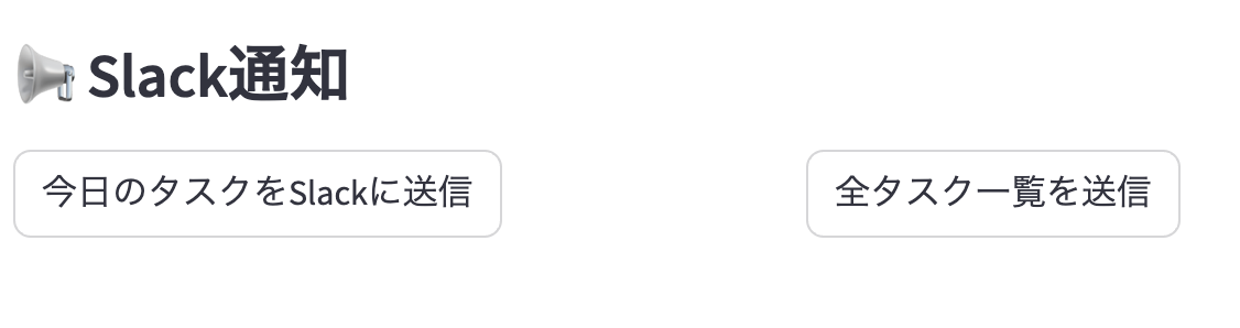 「今日のタスクをSlackに送信」と「全タスク一覧を送信」です。ボタンを押すだけでその時点のタスク状況をSlackに送ることができました。こちらが実際に手動通知した時のSlack画面です。