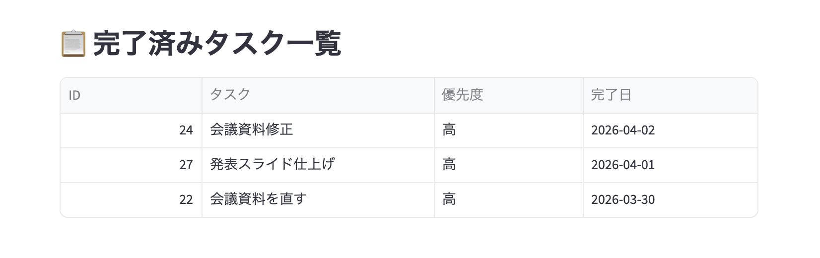 また、Streamlitのst.data_editor()を使うと、テーブルにチェックボックスを追加して完了にできるUIが簡単に作れます。