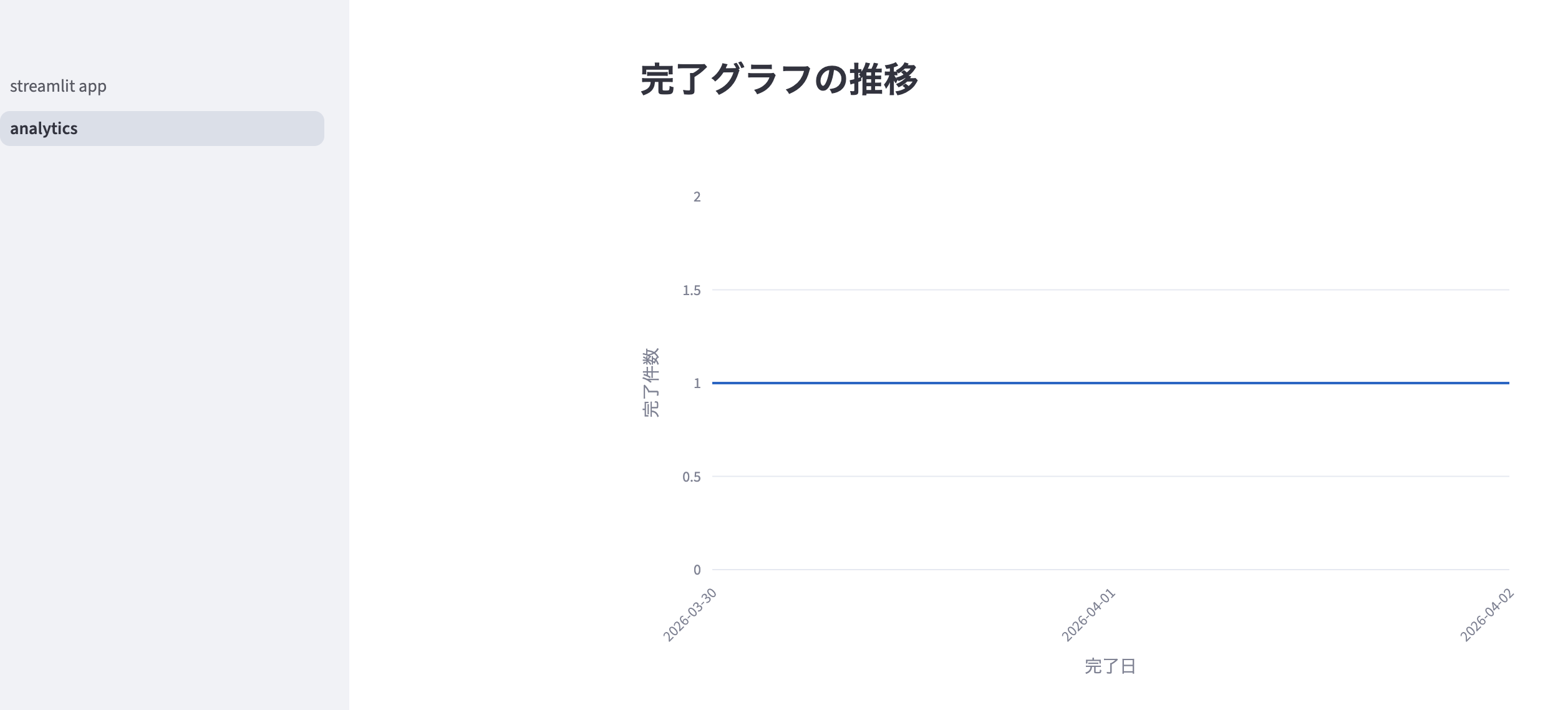 analyticsページ(別ページ)に完了タスクの推移グラフを作りました。Plotlyを使うことで日付単位のグラフを綺麗に表示できます。
