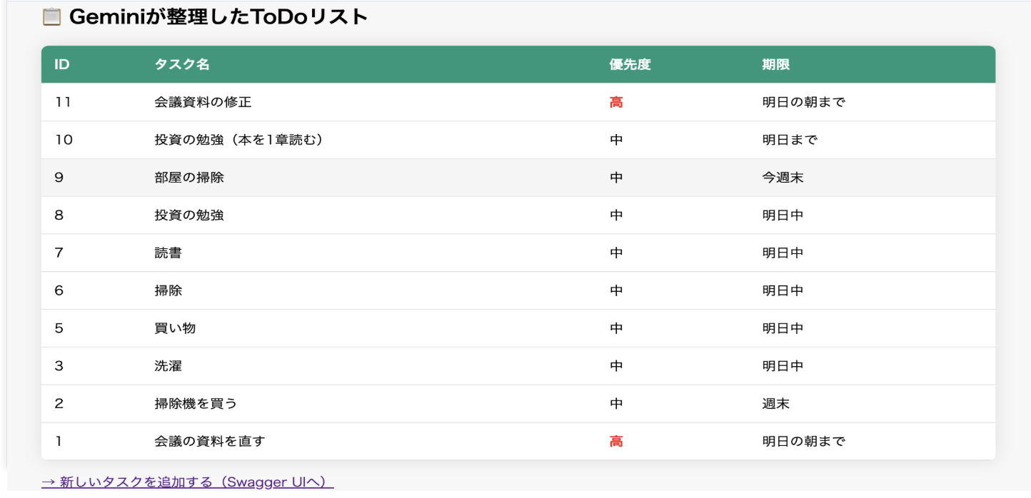 タスク追加はSwagger UIからしかできず、確認はこのHTML画面に戻るという行き来が発生していました。