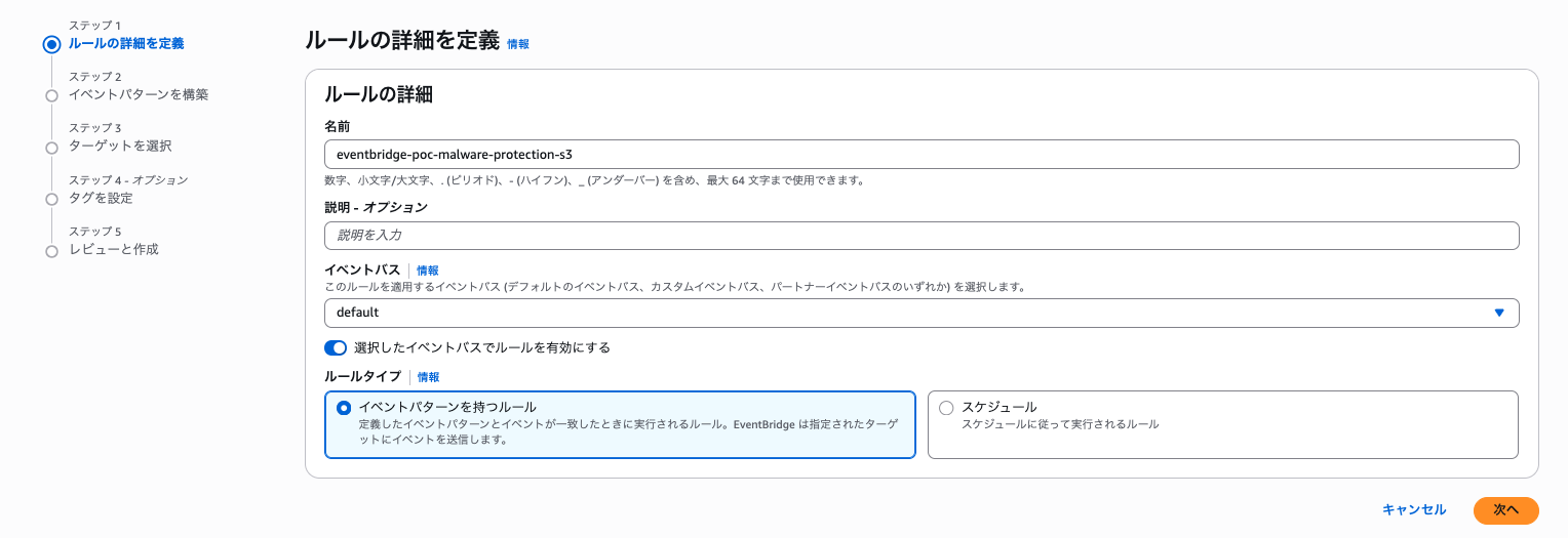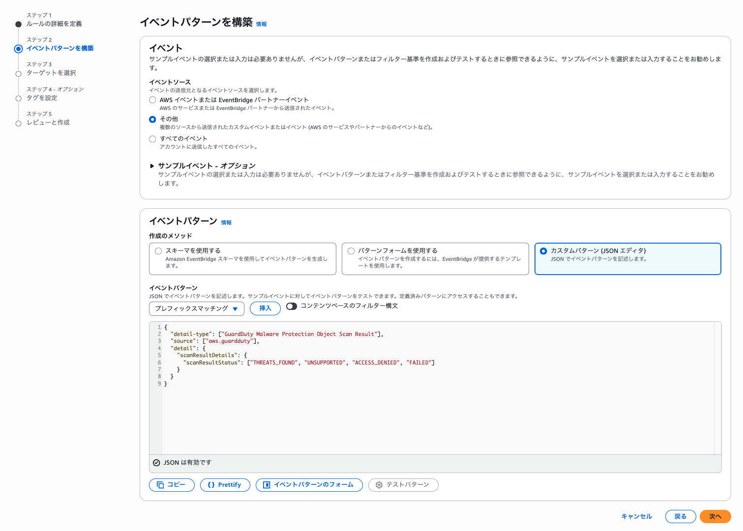 GuardDutyのスキャン結果イベントをトリガーに、SNSへ通知するためのEventBridgeルールを作成します。これが今回の設定の肝です。