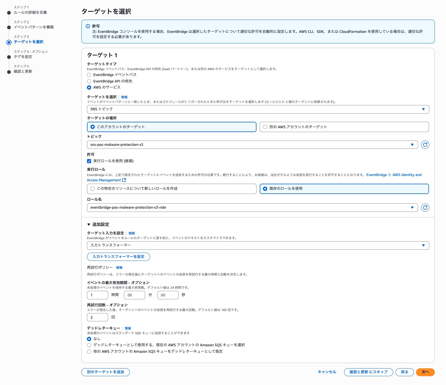 検出したEventの送信先ターゲットにSNSトピックを選択します。