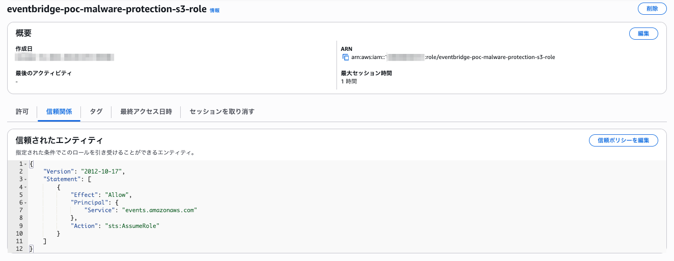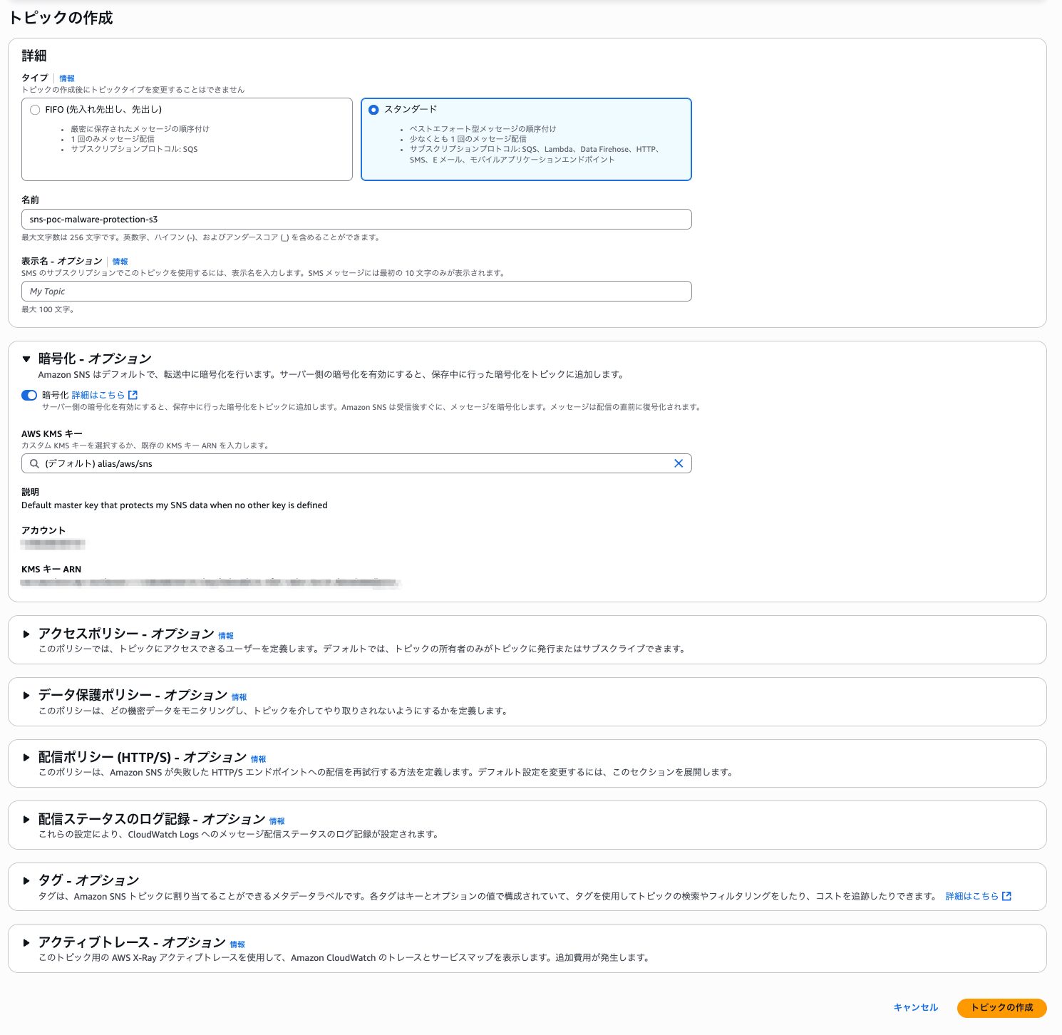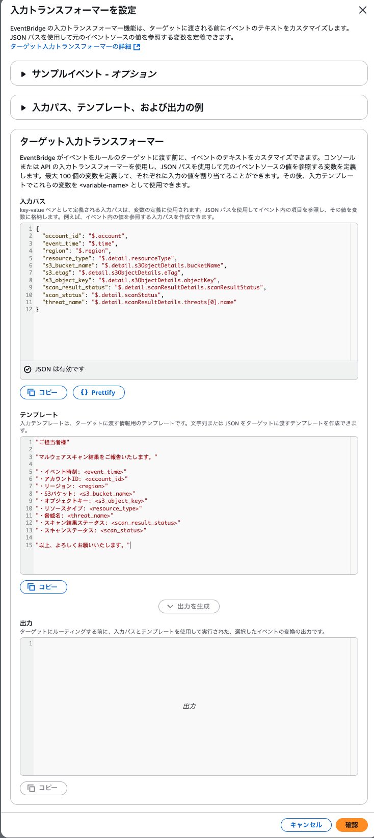 { "account_id": "$.account", "event_time": "$.time", "region": "$.region", "resource_type": "$.detail.resourceType", "s3_bucket_name": "$.detail.s3ObjectDetails.bucketName", "s3_etag": "$.detail.s3ObjectDetails.eTag", "s3_object_key": "$.detail.s3ObjectDetails.objectKey", "scan_result_status": "$.detail.scanResultDetails.scanResultStatus", "scan_status": "$.detail.scanStatus", "threat_name": "$.detail.scanResultDetails.threats[0].name"}入力テンプレート