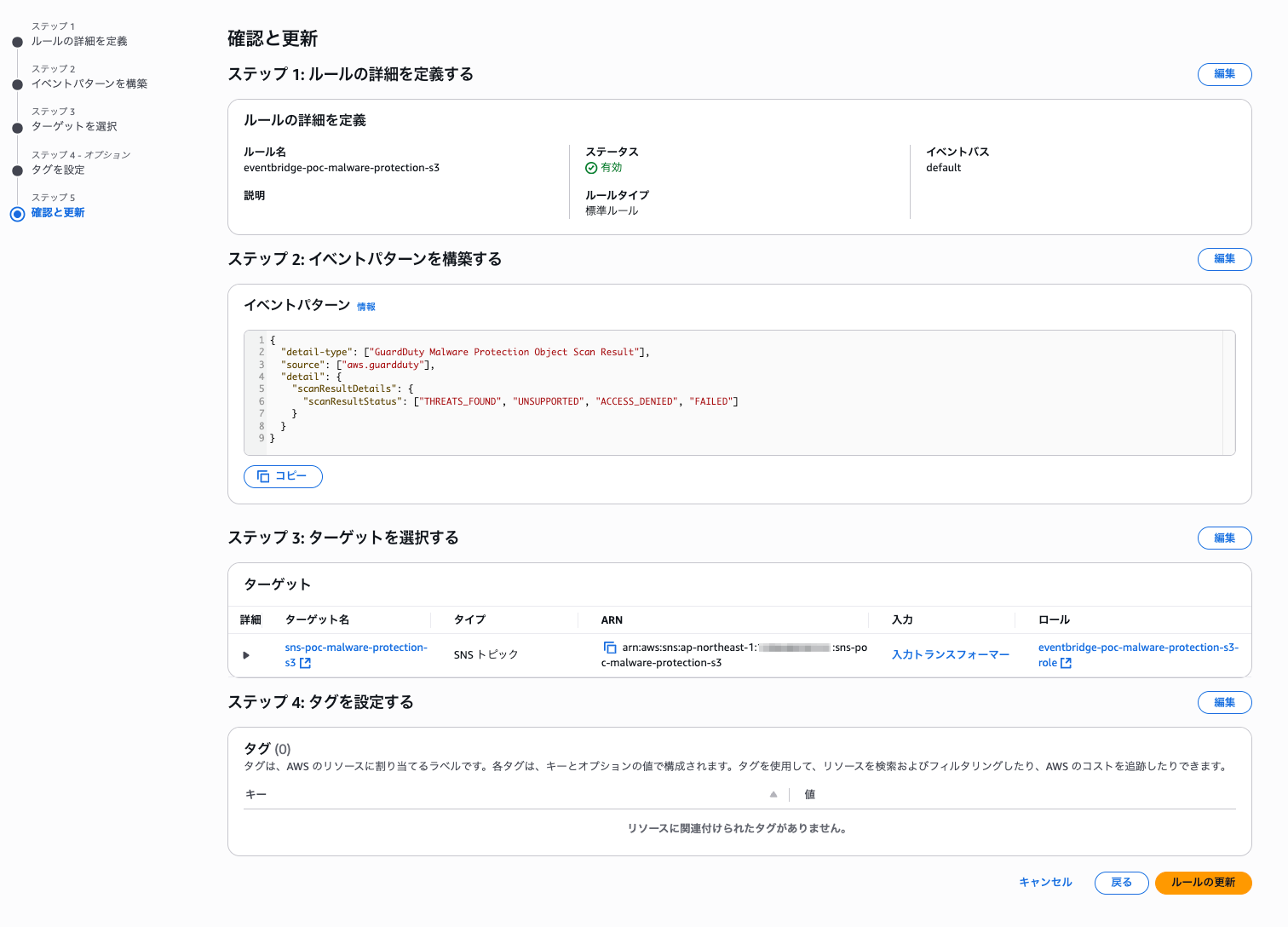 この設定により、指定されたバケットに新しいオブジェクトがアップロードされると、自動的にGuardDutyによるマルウェアスキャンが開始されます。