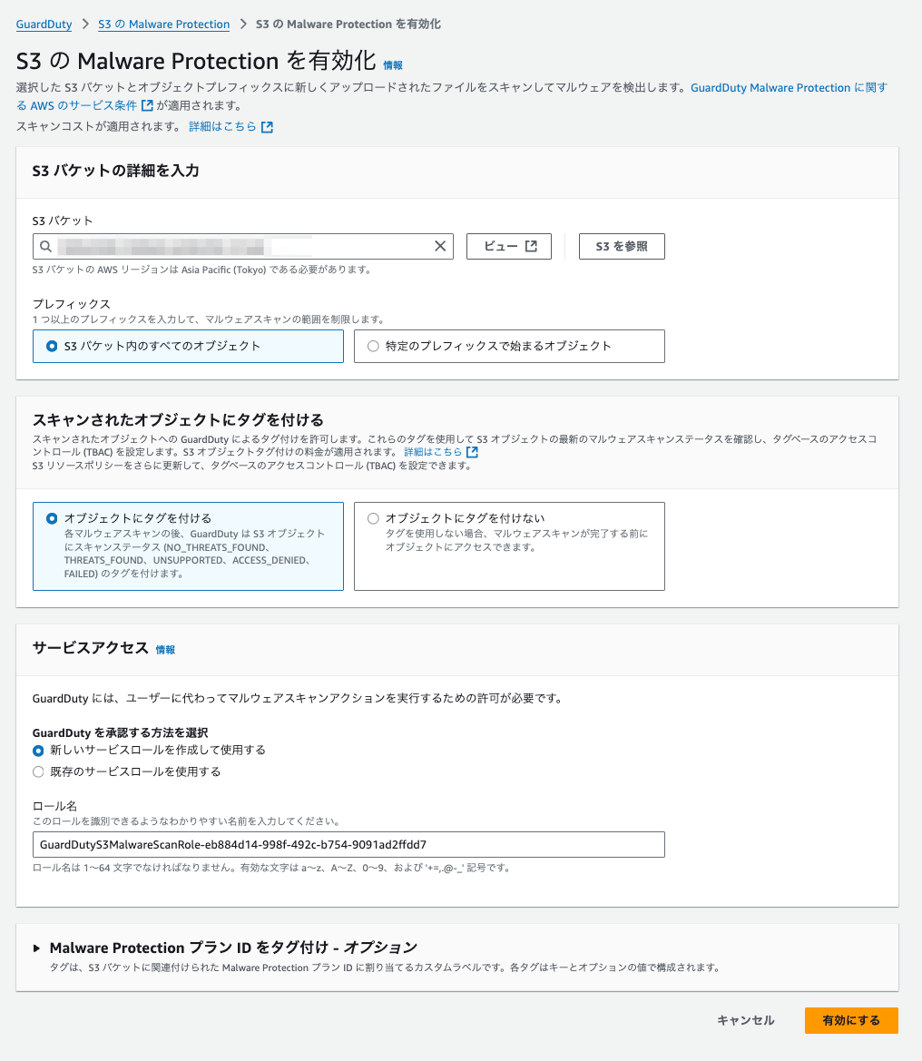 まずは、対象のS3バケットでマルウェア保護を有効にします。