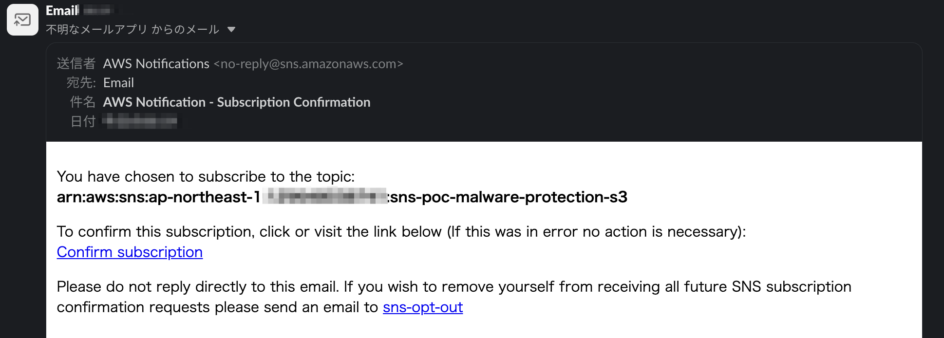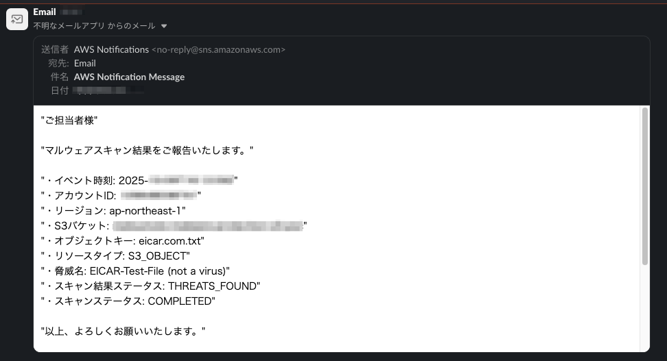 eicar.com.txtを、マルウェア保護を有効にしたS3バケットにアップロードします。 - アラートメールの確認 アップロード後、しばらくするとGuardDutyがファイルをスキャンし、EventBridgeがSNSを介して通知メールを送信します。 Slackチャンネルを確認すると、以下のような内容のアラートメールが届いているはずです。