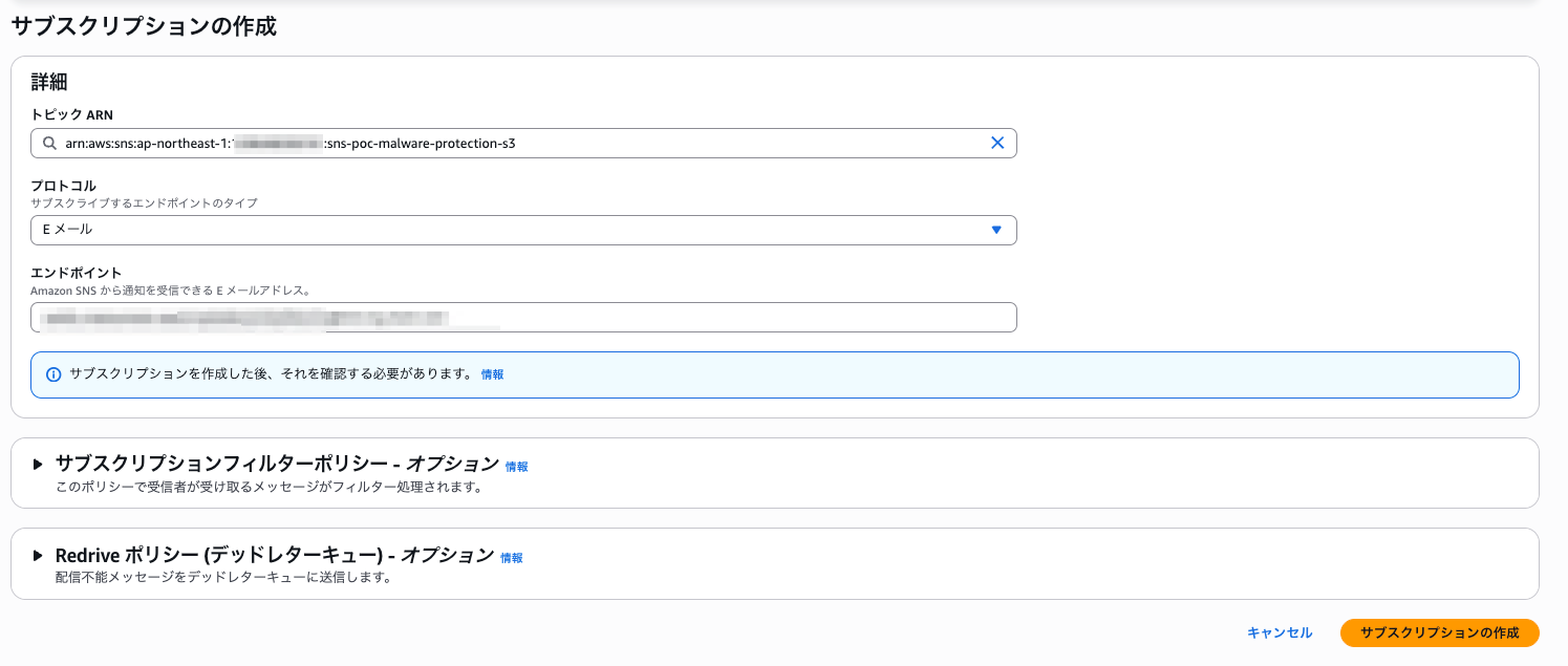 スキャン結果の通知先となるSNSトピックを作成し、Eメール通知(Slackチャンネルメールアドレス)を設定します。