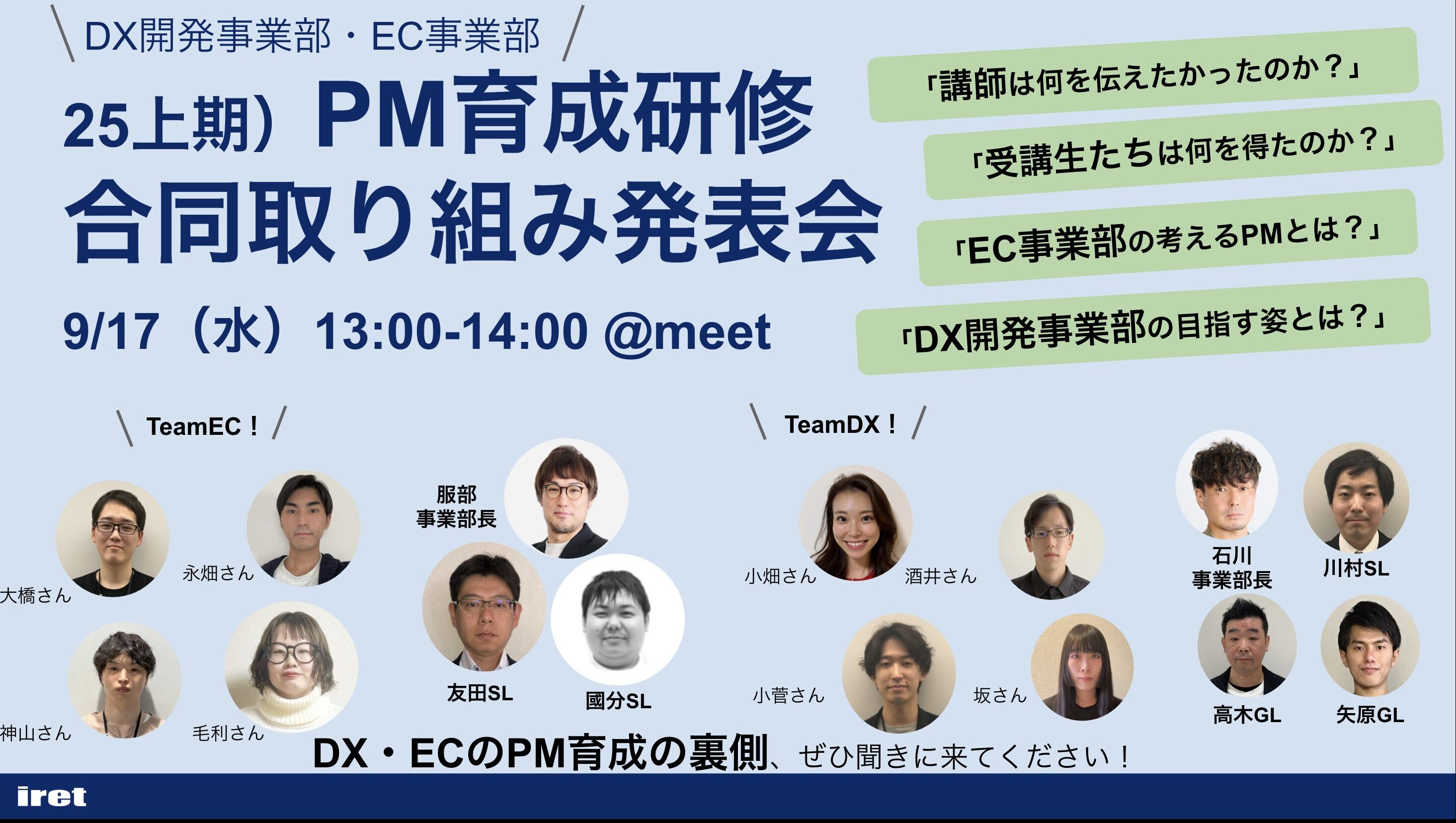 この記事では、9月に両事業部合同で行われたPM研修の「合同取り組み発表会」についてご紹介します。発表会の様子を通じてDX開発事業部・EC事業部、両事業部の受講者の皆さんの様子や、育成への熱い思いをお伝えします!